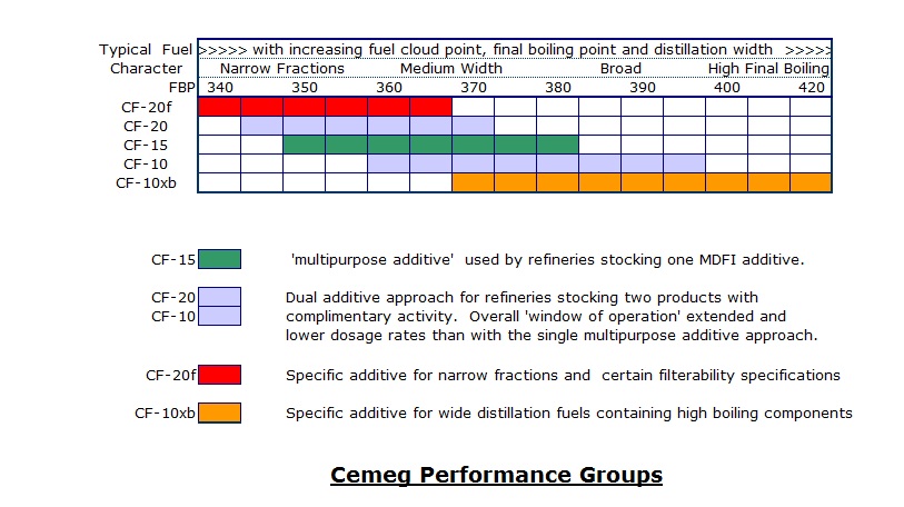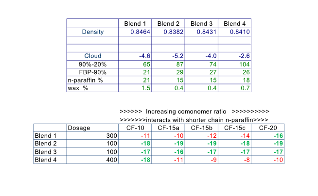 Results from a refinery blending to a -15 CFPP specification experiencing changes in the fuel character between operation modes and feeds. CF-20 is effective in the paraffinic Blend 1 but the more crystalline CF-10 required to react with the broader Blend 4.